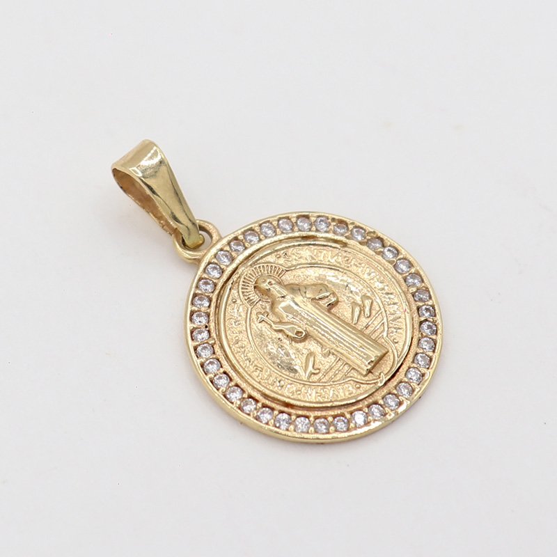 Este hermoso dije de San Benito está elaborado en auténtico oro de 18 quilates, con un peso de 2.6 gramos y una altura de 2.5 cm. Su borde está decorado con finos circones blancos que le dan un toque de luz sin perder su esencia espiritual. Es una pieza ideal para quienes buscan protección y estilo en una joya sagrada.