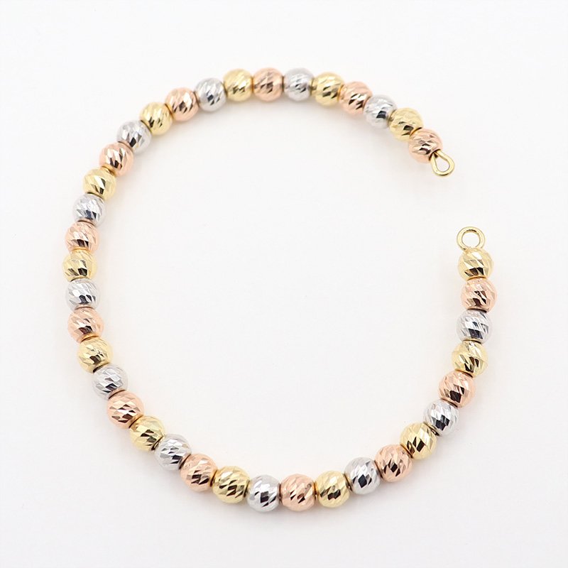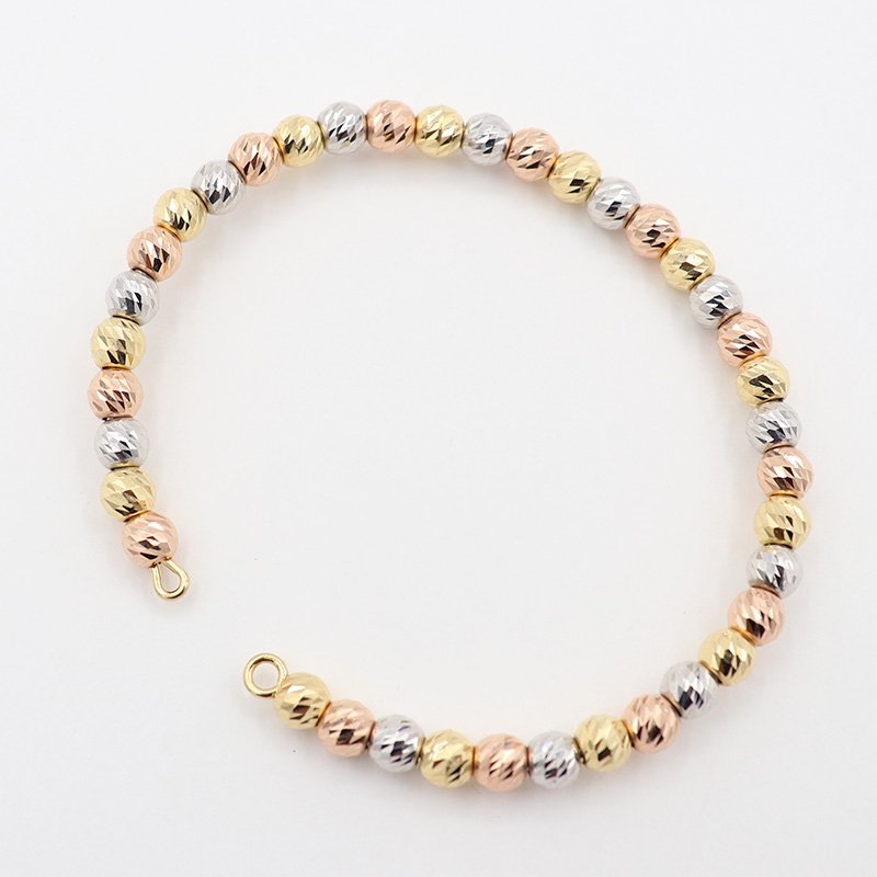 Pulsera de balines facetados en oro tricolor de 18k (amarillo, blanco y rosado). Su acabado diamantado resalta el brillo natural del oro, ofreciendo un diseño llamativo y sofisticado, ideal para uso diario o para complementar un look elegante.