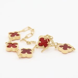 Pulsera elaborada en oro de 18k con diseño inspirado en la icónica joyería Van Cleef. Cuenta con cinco tréboles de cuatro hojas en tono rojo intenso, montados sobre eslabones tipo alargados. Su longitud es de 18 cm y su peso es de 5.51 gramos. Ideal para uso diario o para realzar cualquier atuendo con elegancia y sofisticación.
