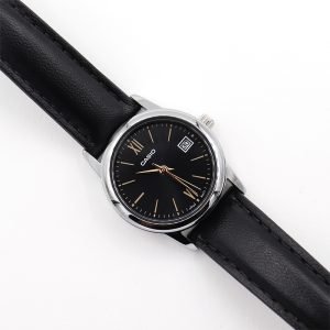 Este reloj Casio combina elegancia y funcionalidad en un diseño sobrio y versátil. Su carátula negra con números romanos en color dorado le da un estilo clásico, mientras que su correa de cuero negro brinda comodidad para el uso diario.