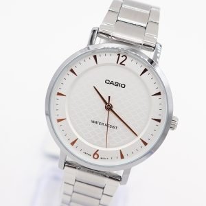 Este reloj Casio combina un diseño moderno y sofisticado con la funcionalidad que distingue a la marca. Su carátula blanca con textura sutil se complementa con marcadores dorados y manecillas estilizadas, creando un look limpio y contemporáneo ideal para cualquier ocasión.
