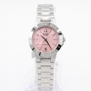 Añade un toque de feminidad a tu look con este elegante reloj Casio para mujer. Su carátula rosada destaca con un diseño limpio y moderno, acentuado por indicadores metálicos y números grandes en las posiciones 6 y 12.